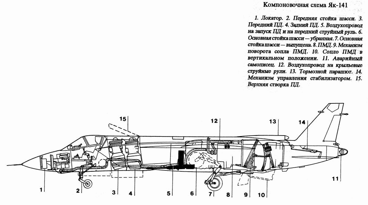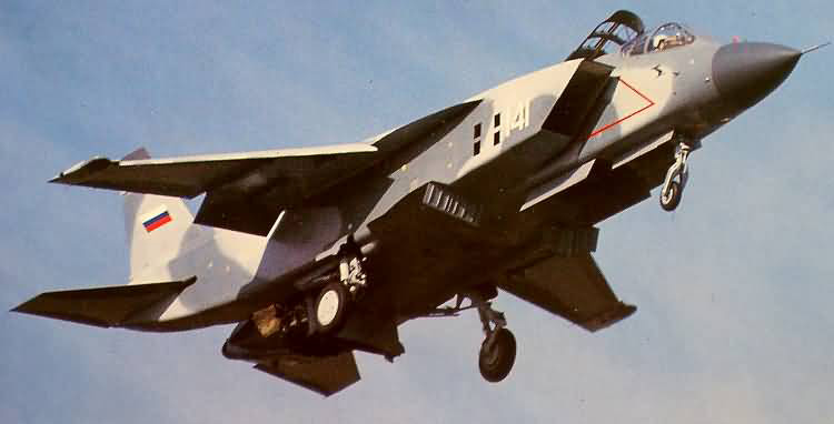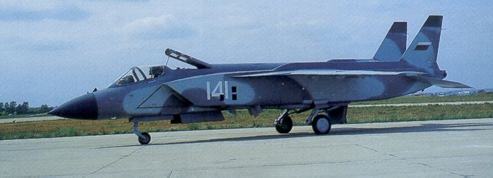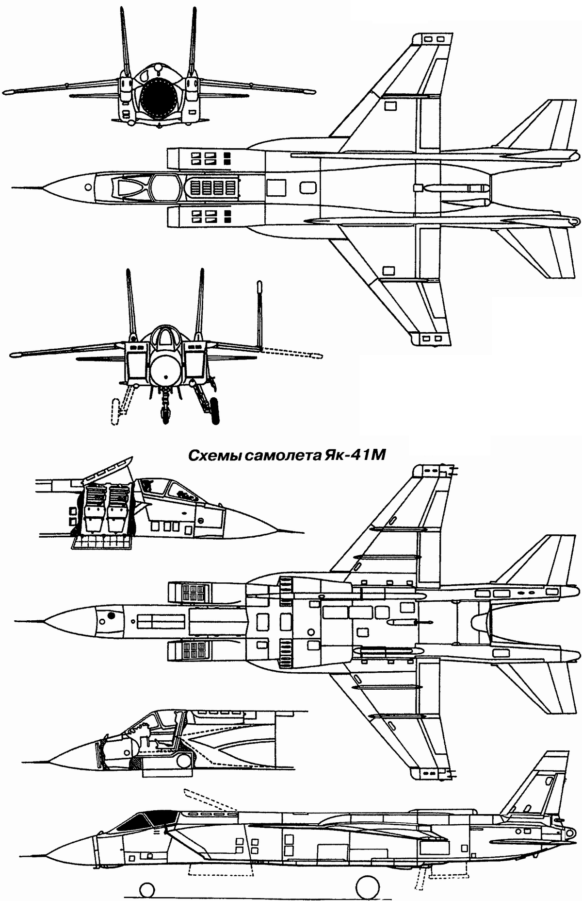Истребитель-перехватчик ВВПЯк-141 - сверхзвуковой, многоцелевой самолёт вертикального взлёта и посадки, предназначен для перехвата воздушных целей и ведения ближнего маневренного боя, а также для нанесения ударов по наземным и надводным целям. В 1986 г. в ОКБ им. А. С. Яковлева была завершена постройка первого экземпляра Як-141. Эта машина первая в мире среди самолетов своего класса преодолела скорость звука. На новом истребителе установили 12 мировых рекордов, в том числе по скороподъемности, достижению максимальной высоты с нагрузкой в 1 и 2 тонны с вертикальным взлетом и посадкой. По времени набора высоты 12 км Як-141 опередил английский истребитель СВВП УХарриерФ почти на 10 секунд. При этом рекордное достижение установлено в теплое время года с нагрузкой 1 т, а УХарриерФ взлетал без нагрузки и зимой, когда плотность воздуха наибольшая, то есть при наиболее благоприятных условиях для работы силовой установки. Впервые Як-141 был показан мировой общественности на 38-ом Международном авиакосмическом салоне в Бурже. Як-141 - многоцелевой сверхзвуковой истребитель вертикального взлета и посадки - предназначен для перехвата воздушных целей, ведения ближнего боя, нанесения штурмовых ударов по наземным и надводным целям. Может эксплуатироваться на взлетно-посадочных площадках ограниченного размера и кораблях. Он способен взлетать без выруливания на взлетно-посадочную полосу непосредственно из укрытий по выводной рулежной дорожке, обеспечивая массовый взлет и ввод в бой подразделений Як-141 по сигналу тревоги. Як-141 представляет собой самолёт нормальной аэродинамической схемы с высокорасположенным крылом, двухкилевым вертикальным оперением и следующей схемой расположения двигателей: один подъёмно-маршевый двигатель располагается в хвостовой части фюзеляжа и два подёмных двигателя располагаются сразу за кабиной лётчика. Крыло стреловидное с изломом задней кромки и корневыми наплывами, консоли складываются примерно на полуразмахе при размещении самолёта на корабле. Планер самолёта состоит на 26% из КМ, включая углепластиковые поверхности хвостового оперения, закрылки, носки и наплывы крыла. Остальная конструкция в основном выполнена из алюминиево-литиевого сплава. Пилотажно-навигационный комплекс обеспечивает ручное, директорное и автоматическое управление самолётом от взлёта до посадки в любое время суток в различных метеоусловиях на всех географических широтах. Система управления вооружением включает многорежимную бортовую импульсно-допплеровскую РЛС УЖукФ с единой индикацией и обеспечивает решение задач с применением различных видов оружия. Имеется также лазерный дальномер и ИК датчик поисково-следящей системы, Аппаратура радиоэлектронного подавления смонтирована в законцовках крыла и килей. В перегородках, простирающихся от килей вперёд, могут размещаться устройства выброса тепловых ложных целей или дипольных отражателей. Впервые самолёт Як-141 был показан на 39-м авиакосмическом салоне в Ле Бурже 15 июня 1991 года. Существует в проекте модификация Як-141М с тягой основного двигателя 17500 кгс, сниженной радиолокационной и тепловой заметностью. В настоящее время коллектив разработчиков определил основные направления модернизации самолета Як-141: это улучшение летно-технических характеристик за счет увеличения тяги под