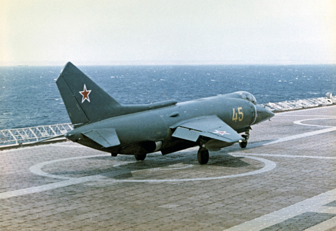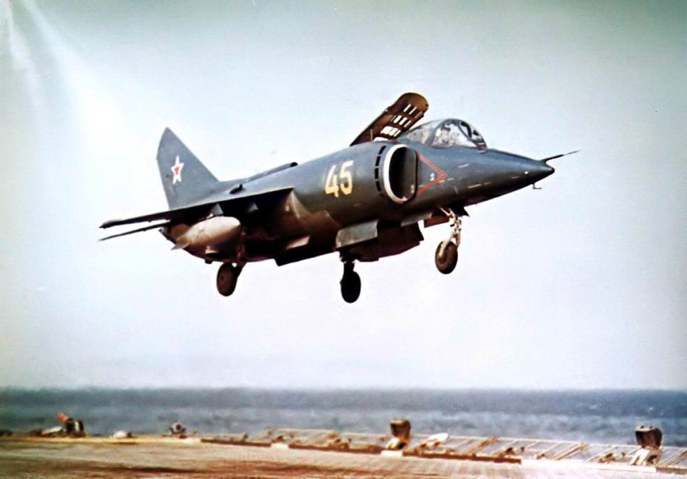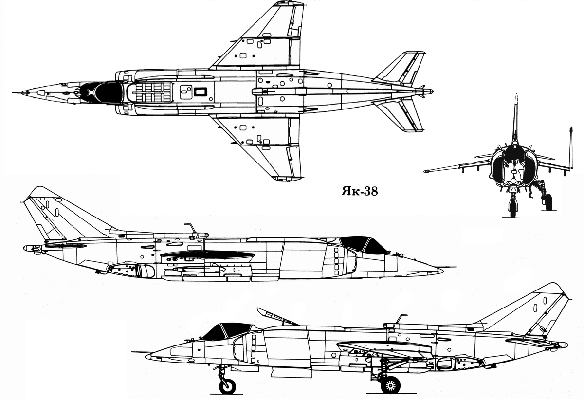В послевоенный период стало ясно, что наиболее уязвимой частью боевой авиации являются аэродромы, особенно ВПП. С целью радикального решения проблемы в 50-х годах в раде стран, в том числе и в СССР, начались работы по созданию самолётов вертикального взлёта. В 1962 году в ОКБ-115 А.С.Яковлева был разработан экспериментальный самолёт вертикального взлёта Як-36. Яковлев вышел в правительство с предложением построить серию из 10-12 самолётов для отработки корабельного базирования. Но силовая установка Як-36 оказалась слишком слабой, чтобы поднять в воздух какое-либо вооружение. Требовалась разработка нового самолёта. Предварительное проектирование боевого СВВП началось летом 1967 года в инициативной группе под руководством главного конструктора С.Г.Мордовина. Осенью к этой работе подключился ведущий инженер В.Н.Павлов (впоследствии стал главным конструктором СВВП в ОКБ Яковлева). В результате были разработаны общий вид, компоновка и идеология основных систем. 27 декабря 1967 года вышло Постановление ЦК КПСС и СМ СССР №1166-413 о создании лёгкого штурмовика ВВП Як-36М. 25 января 1969 года Главком ВВС К.А.Вершинин утвердил ТТТ к самолёту. Эти ТТТ были также согласованы с командующим авиацией ВМФ. В сентябре 1968 года ОКБ приступило к эскизному проектированию и постройке макета. Результаты были представлены макетной комиссии в начале марта 1970 года. Для отработки различных систем был построен ряд стендов. Прицельно-навигационный комплекс отрабатывался на самолёте Як-28У. 15 апреля была завершена пастройка первого прототипа Як-36М. 22 сентября 1970 года он впервые поднялся в воздух (лётчик-испытатель В.Г.Мухин). Заводские испытания на 4 прототипах продолжались до апреля 1972 года. После этого второй, третий и четвёртый прототипы были перегнаны в Ахтубинск, где начались Государственные совместные лётные испытания. 18 ноября 1972 года лётчик-испытатель М.С.Дексбах на втором прототипе впервые совершил посадку на палубу корабля (противолодочный крейсер "Москва"). Государственный испытания продолжались до октября 1975 года. В 1973 году началась подготовка к серийному производству на Саратовском авиазаводе. В 1974 году были собраны первые 3 серийных самолёта. Первый из них был передан в испытательный центр в Ахтубинске, второй - в центр пилотов морской авиации в Саках, третий - в ЛИИ. 11 августа 1977 года самолёт принят на вооружение ВМФ под обозначением Як-38. Як-38 построен по аэродинамический схеме среднеплана. Конструкция цельнометаллическая (коррозионностойкий сплав 01420). Фюзеляж типа стрингерный полумонокок овального сечения. Крыло двухлонжеронное, трапецевидное в плане (стреловидность по передней кромке 45°), малого удлинения, складывающееся на стоянке. Механизация крыла состоит из элеронв и выдвижных закрылков. Шасси трёхопорное, с носовой стойкой, убирается в фюзеляж. Силовая установка состоит из подъёмно-маршевого двигателя Р-27В-300 (на Як-38М - Р-28-300) и 2 подъёмных РД-36-35ФВР (на прототипах РД-36-35ФВ, на Як-38М - РД-38). Подъёмно-маршевый двигатель расположен в средней части фюзеляжа, имеет боковые однорежимные воздухозаборники с отделением пограничного слоя и нерегулируемым соплом с 2 поворотными насадками. Подъёмные двигатели расположены один за другим в передней части фюзеляжа. Их воздухозаборники и реактивные сопла закрываются управляемыми створками. Для предотвращени