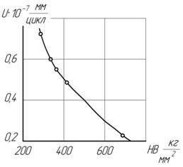 Experimental research of influence of hardness of active surfaces of teeth on their longevity was fulfilled in conditions of Pridneprovskiy hydroelectric power plant on Ш-50 mills. Gear teeth were exposed to case-hardening by high-frequency currents. In result of imperfection of production method, surface hardness of various teeth was different. During operation of gear wheel, wear rate of teeth was measured, depending on the hardness of their active surfaces. Experimental results are shown in the figure 4.