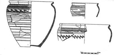 Индивидуальные находки из заполнения котлована представлены двумя неопределенными предметами из черного металла, каменным оселком и двумя обломками глиняных воздуходувных сопел. Керамический материал - 59 фрагментами лепных и 628 фрагментами гончарных сосудов. В слое глиняной обмазки, в северной части котлована, зафиксированы развалы еще трех раннекруговых сосудов (Рис. 4), возможно, специально разбитых во время строительства печи. По характеру керамического материала и стратиграфии участка сооружение датируется XI в.