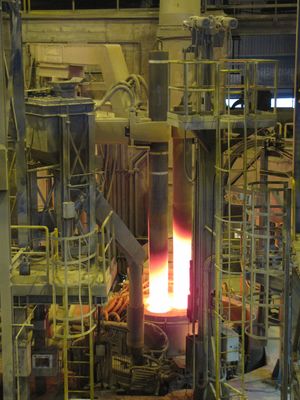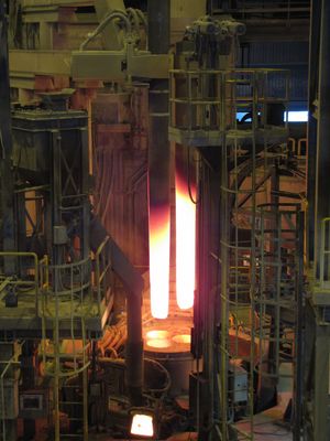 ИсторияВ начале 19 века В. В. Петров увидел возможность получения при помощи электрической дуги чистых металлов из их оксидов (руд). Этот процесс восстановления металлов лежит в основе современной электрометаллургии. Первые дуговые электрические печи для восстановления из руд были построены в конце 1870 годов. Но электропечи расходуют очень много электроэнергии, поэтому их промышленное применение началось только тогда, когда стали строить мощные электростанции и была решена проблема передачи электрической энергии на расстояние. В настоящее время наблюдается устойчивая тенденция увеличения доли стали, выплавляемой в электропечах. Современные электросталеплавильные цехи оснащены самым современным высокотехнологичным оборудованием. Чаще всего, для массового производства используют электропечи, работающие в комплексе с машинами непрерывного литья заготовок (МНЛЗ). Устройство дуговых печей В дуговых печах косвенного нагрева – между двумя электродами. Наибольшее распространение получили дуговые печи прямого нагрева, применяемые для плавки черных и тугоплавких металлов. Дуговые печи косвенного нагрева применяются для плавки цветных металлов и чугунов. Установки дуговых печей — крупные потребители электроэнергии, их единичные мощности измеряются тысячами и десятками тысяч киловатт. Расход электроэнергии на расплавление тонны твердой завалки достигает 400—600 кВг-ч. Поэтому питание печей производится от сетей 6, 10 и 35 кВ через понизительные печные трансформаторы (максимальные значения вторичного линейного напряжения трансформаторов лежат обычно в пределах до 320 В у печей малой и средней емкости и до 510 В у крупных печей). Короткая сеть дуговой печи состоит из ошиновки в трансформаторной камере, гибкой кабельной гирлянды, трубошин, электрододержателя и электрода, перемещающихся вместе с кареткой. На дуговых печах емкостью до 10 т используют схему «звезда на электродах», когда вторичные обмотки печного трансформатора соединены в треугольник на выходе из камеры. Другие схемы короткой сети, позволяющие уменьшить ее реактивное сопротивление, применяют на более мощных печах. В электроприводах механизмов печи применяют обычно асинхронные двигатели с короткозамкнутым ротором напряжением 380 В на мощности от 1—2 кВт в небольших печах до 20—30 кВт в более крупных печах. Двигатели приводов перемещения электродов — постоянного тока с питанием от электромашинных или магнитных усилителей, а также от тиристорных преобразователей. Эти приводы входят в состав самостоятельного агрегата — регулятора мощности печи. В печах емкостью более 20 т с целью увеличения производительности и облегчения труда сталеваров предусматриваются устройства для перемешивания жидкой ванны металла, основанные на принципе бегущего магнитного поля. Под днищем печи из немагнитного материала размещается статор с двумя обмотками, токи которых сдвинуты по фазе на 90°. Создаваемое статорными обмотками бегущее поле приводит в движение слои металла. При переключении обмоток возможно изменение направления движения металла. Частота тока в статоре перемешивающего устройства от 0,3 до 1,1 Гц. Питание устройства производится от электромашинного преобразователя частоты. Двигатели, обслуживающие механизмы дуговых печей, работают тяжелых условиях (пыльная сре
