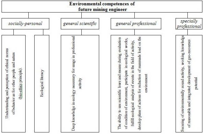 The carried out analysis gives the possibility to determine environmental competence of future mining engineer as personal formation, which includes the acquired during preparation profession-oriented environmental awareness (cognitive component), adopted ways for securing environmentally safe mining works (praxeological component) in the interest of sustainable development (axiological component) and the qualities of socially responsible ecological behavior (socially- behavioral component) are formed.