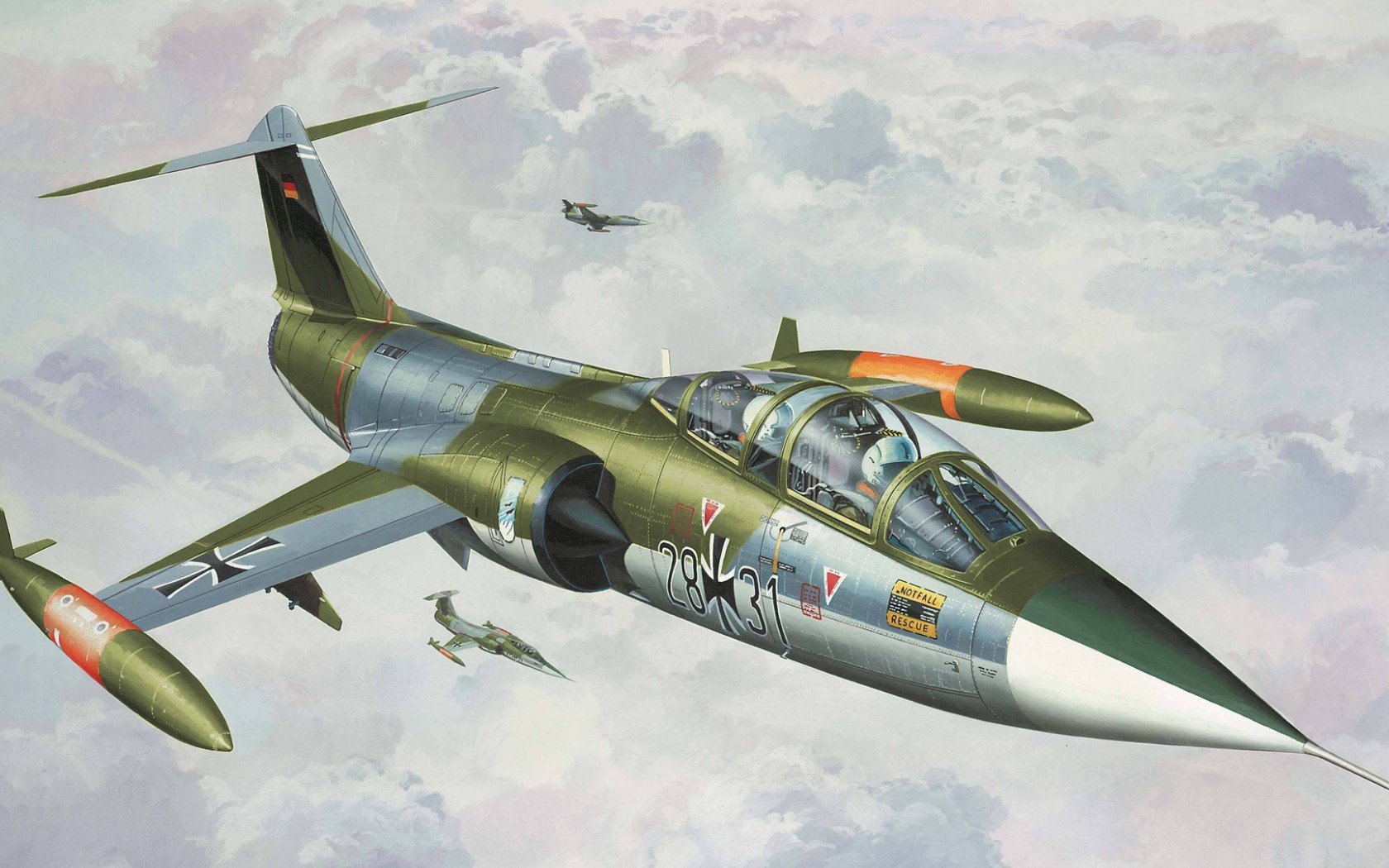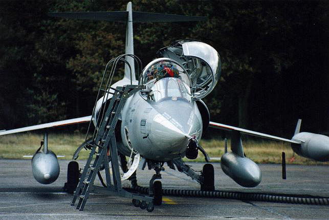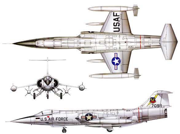 ВооружениеВстроенная шестиствольная пушка Дженерал Электрик М61 (20 мм, 300 патронов) установлена в носовой части фюзеляжа одноместных самолетов слева по борту, предусмотрена ее замена на дополнительный топливный бак емкостью 462 л; на двухместных самолетах отсутствует американский F-104A кроме пушки (которая на нем установлена с 1964 г.), нес лишь две УР AIM-9B на концах крыла; на пакистанских F-104A использовалось также бомбовое оружие. F-104C с самого начала был оснащен и оружием класса воздух-земля, F-104G имеет пять точек подвески вооружения, рассчитанных на максимальную нагрузку 2720 кг, F-104S - девять точек, на которых может подвешиваться нагрузка до 3175 кг. Подвесное вооружение F-104G может включать обычные (в том числе калибра 907 кг) и ядерную (на F-104C - бомба Мк.28 в контейнере MN-1A на центральном подфюзеляжном узле) бомбы, УР класса воздух-воздух AIM-9 УСайдуиндерФ и воздух-поверхность AGM-12B УБулпапФ, НАР, управляемые бомбы, бомбовые кассеты, мины, баки с напалмом. На F-104S встроенная пушка снята для установки системы наведения УР AIM-7 УСпэрроуФ, которые подвешиваются на подкрыльных пилонах, могут подвешиваться блоки НАР, контейнер с пушкой М61 и боезапасом 725 патронов. F-104S ASA вооружен УР класса воздух-воздух УАспидФ 1А средней дальности и AIM-9L малой дальности.