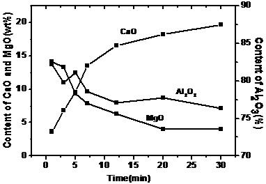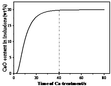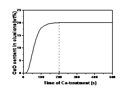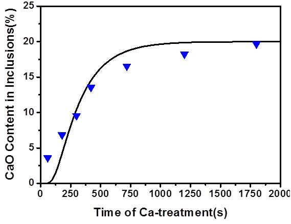 The relationship between the time of the Ca-treatment and the CaO content in the inclusion is shown in Figure 8. Figure 6 Content of CaO in inclusions when treating the diffusion of Ca and Mg in the boundary layer as the rate-controlling step. Figure 6 shows that when the diffusion of Ca and Mg in the boundary layer is the rate-controlling step, CaO in the inclusion quickly becomes saturated (40 s), which indicates that Ca and Mg diffuse faster in the boundary layer of molten steel than the diffusion of Ca and Mg in the inclusion layer. Figure 7 Comparison of the results of the model and experiment of the CaO content in inclusions with Ca-treatment time. 4. Conclusions 1) A kinetic model is developed based on the experiment results to predict the time of modification of MgO–Al2O3 inclusions. The results predicted by the kinetic model and those obtained by experiments are in good agreement. Acknowledgments The authors are grateful for support from the National Science Foundation China(51304016). References