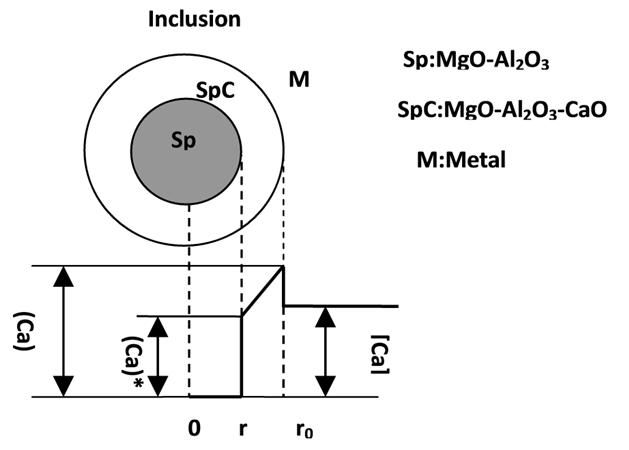 1. Introduction MgO–Al2O3 spinel inclusions are unfavorable for both the quality of products and the castability of the steel because of their high melting point and high hardness.[1] To reduce the negative effects of MgO–Al2O3 spinel inclusions, it is important to modify the inclusions into liquid inclusions in the molten steel. Many studies[2–6] have investigated the modification of MgO–Al2O3 inclusions by Ca-treatment. Itoh et al.[2] found that even a very small amount of Ca in the steel can significantly decrease the stability of spinel inclusions and dramatically increase the stability of liquid MgO–Al2O3 inclusions. Young et al.[3] studied the formation mechanism of liquid calcium alumina inclusions originating from MgO–Al2O3 spinel materials, and found that spinels reacted with the dissolved Ca, forming a liquid calcium aluminate phase. Pistorius et al.[4] suggested that MgO could substantially contribute to liquefy inclusions by calcium treatment, so less calcium was needed when MgO was present in the starting inclusions. They concluded that calcium treatment can successfully modify spinel inclusions to mixed alumina–lime–magnesia inclusions and they change from irregular to globular in shape. 2. Kinetic Experiments of Ca-treatment 2.1 Methodology The description of the equipment used to carry out the experiments for modification of MgO–Al2O3 inclusions by Ca-treatment can be found in this literature.[7] The experimental steel is 30CrMo, with a composition (in wt%) of C 0.30, Si 0.22, Mn 0.52, P 0.015, S 0.007, Mo 0.10, V 0.12, Cu 0.07, and Cr 0.94. The experimental procedure is as follows. A total of 390 g of 30CrMo steel was melted in a crucible at a temperature of 1600 °C for homogenization. 0.3 g of aluminum wire was then added to the melt for . After about 5 min, 4 g of Mg was added into the melt. Ca-treatment using 4 g calcium silicide addition in powder form was performed about 10 min later. Liquid steel samples were taken by quartz tubes at various times after Ca-treatment: 1, 3, 5, 7, 12, 20, and 30 min. Some of the samples were used to analyze the composition of the steel and the others were used for the observation of inclusions. 2.2 Variation of Inclusion Composition Figure 1 shows the variation of the average composition of the inclusions. After Ca-treatment, the average content of CaO sharply increases in the first 7 min, and then gradually increases from 7–30 min. After about 20 min, the value changes little and remains at about 20%. The MgO and Al2O3 contents in the inclusions rapidly decrease after Ca-treatment. Figure 1. Variation of inclusion composition after Ca-treatment. 3. Kinetic Model of Ca-treatment for MgO–Al2O3 Inclusions As discussed above, deoxidation by Al generates a mass of Al2O3 inclusions that will react with Mg existing in the melts. Thus, the inclusion components change from Al2O3 to MgO–Al2O3. The Mg in the melts is artificially added, although in practice MgO in the slag or ladle lining can be reduced by Al and the reaction product Mg enters into the molten steel. Calcium treatment can modify irregular-shaped spinel inclusions into globular CaO–Al2O3–MgO inclusions. The modification mechanism is (1) diffusion of the dissolved Ca in the boundary layer, (2) diffusion of Ca in the CaO–Al2O3–MgO inclusions, (3) reaction between Ca and MgO–Al2O3 at the interface, (4) diffusion of the dissolved Mg in the inclusions, and (5) diffusion of the dissolved Mg in the boundary layer. 3.1 Diffusion of Ca or Mg in the Inclusion Layer as the Rate-Controlling Step The kinetic equations and the method of calculation are completely different when treating the diffusion of Ca and Mg in the inclusion as the rate-controlling step separately, which is due to the different diffusion coefficients of Ca and Mg in MgO–Al2O3–CaO inclusions. Here, only the diffusion of Ca as the rate-controlling step will be discussed in detail. For the case of Mg, we will only show the calculated results. Fig. 2 Distribution of Ca content when treating the diffusion of Ca in the inclusion layer as the rate-controlling step.