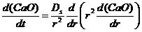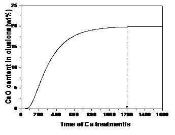 Equation (1) is a type of partial differential equation that is difficult to solve through analytical methods, and it is better to employ numerical methods to obtain the approximate solution at a certain precision. In this kinetic model, we used the finite difference method to solve the basic equation. Finite difference methods can be divided into direct difference and implicit difference methods. Starting from the differential equation, the method replaces the derivative by the difference quotient, and connects the differential equation and the solution under definite conditions into a linear system, which can be solved to obtain a numerical solution of discrete points. Therefore, the choice of space and time step is limited during the process of equation discretization. This model adopts the implicit difference method to solve the equation, and then based on the discrete equations we wrote a code to solve the equation. Treating the concentration range of CaO in the inclusion as the boundary condition, the model will calculate the time for a given size inclusion particle to grow to saturation. Fig. 3 Calculated result of the CaO content in an inclusion when treating the diffusion of Ca in inclusion layer as the rate-controlling step. As mentioned above, when the rate-controlling step is the diffusion of Mg in the inclusion layer, the kinetic equation, the calculation method, and the boundary conditions are the same as when Ca is considered to be the rate-controlling step. The only difference is the diffusion coefficient. For the diffusion coefficient of Mg in the spinel inclusion, we used the diffusion coefficient of Mg in the MgO–Al2O3–CaO inclusion layer: DMg-Inc = 3.2 × 10−13 m2/s.[9] The change of CaO content with time is shown in Figure 4, which shows that the time needed for the CaO content to become saturated in the inclusion is about 1200 s. Fig. 4 Calculated result for the CaO content in inclusions with respect to time of Ca-treatment(s) when treating the diffusion of Mg in the inclusion layer as the rate-controlling step. 3.2 Diffusion of Ca or Mg in the Boundary Layer as the Rate-Controlling Step When diffusion of Mg and Ca in the inclusion is sufficiently fast, the rate-controlling step will be the diffusion of Ca or Mg in the boundary layer during the process of Ca-treatment, and the concentration of Ca and Mg in the inclusion is assumed to be constant. The diffusion of Ca and Mg in the boundary layer and the diffusion equations of Ca and Mg are the same. Because the difference between the diffusion coefficients of Mg and Ca is small, they will be regarded as the same during the calculations. Thus, they will also have the same kinetic model. Consequently, only the diffusion of Ca in the boundary layer will be discussed.