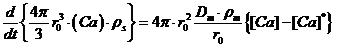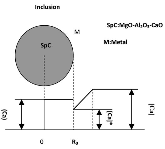 Fig. 5 Distribution of Ca content when the diffusion of Ca in the steel boundary layer is the rate-controlling step. where (Ca) is the concentration of calcium in the inclusion, [CaO] is the concentration of calcium in the steel, [Ca]* is the calcium concentration close to the steel side on the reaction interface, and (Ca)′ is the calcium concentration close to the inclusion side on the reaction interface. Because the size of the inclusions is quite small ((1.0–5.0) × 10−6 μm), we assume that there is material transmission only on the liquid steel side of the interface; namely, (Ca) is equal to (Ca) ′.