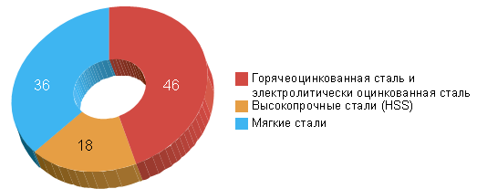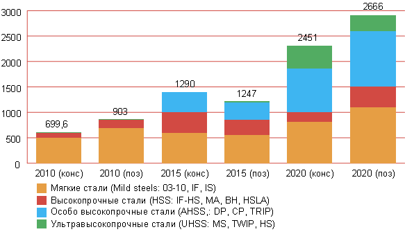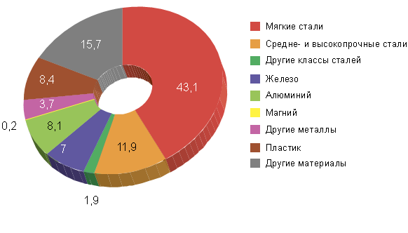 Несмотря на увеличение использования в автомобилестроении новых конструкционных материалов, ведущую роль в производстве продолжает играть стальной прокат. Так, в среднем на российский легковой автомобиль приходится 75% готового проката, метизов и стальных труб, а 25% составляют литейный чугун, цветные металлы, пластмасса, резина, стекло и прочие материалы. Уступая пластмассам и легким металлам по удельному весу, стальные изделия обеспечивают более высокую прочность и, соответственно, надежность и безопасность. Во времена СССР потребление стали в отрасли было гораздо выше при сравнимых объемах выпуска автомобилей из-за использования более ресурсоемких технологий. Так, в 1990 г. при объеме производства автомобилей на уровне 1,82 млн. ед. потребление всех видов проката черных металлов составляло 3,64 млн. т, а в 2008 г., при сравнимом объеме производства (1,8 млн. ед.), потребление достигло лишь 2,5 млн. т. Требования автомобилестроителей к стали являются составным элементом общих требований к современному автомобилю. С течением времени они претерпевают определенные изменения. Прежде всего, это связано с ростом требований к весу автомобиля: чем он меньше, тем экономичнее расходуется горючее, снижается нагрузка на окружающую среду, и появляется возможность добавлять больше опций и оборудования. Второе направление – повышение норм безопасности, выполнение которых требует максимального упрочнения силового каркаса кузова для защиты людей и деформируемости внешних элементов для поглощения удара. Третьим направлением является стоимость производства, последующего обслуживания и утилизации. Именно этот фактор обеспечивает сохранение лидирующих позиций стали в сравнении с другими материалами, поскольку сталь подвержена многократному рециклингу: старые транспортные средства можно утилизировать, и уже бывшую в эксплуатации сталь использовать для производства нового автомобиля.