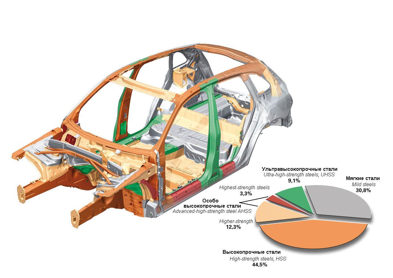 Примером использования высокопрочных и особо высокопрочных сталей в автомобиле может служить модель Audi Q5. Доля стандартных мягких сталей в кузове этого кроссовера составляет 31% (из них изготовлены особо сложные в штамповке элементы, а также внешние детали, поглощающие энергию при ударе), высокопрочных – более 44% (почти весь силовой каркас, защищающий пассажиров), особо высокопрочных – почти 25% (из них при этом 9,1% ультравысокопрочных сталей нового поколения, которые используются в наиболее ответственных участках).