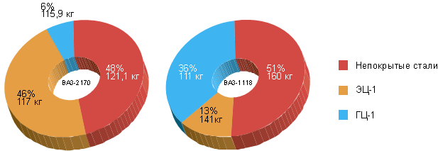 Массовая доля оцинкованного проката в кузовах автомобилей ВАЗ-2170 (Lada Priora), ВАЗ-1118 (Lada Kalina)
