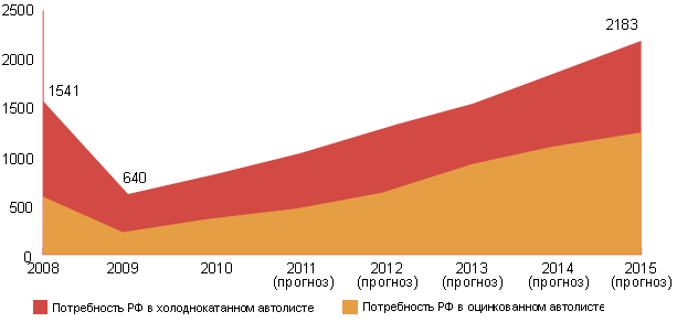 Потребление оцинкованного проката, который включает в себя ЭЦ- и ГЦ-прокат, в автомобильной отрасли России не превышает 100 тыс. т в год. При этом доля горячеоцинкованного проката составляет в настоящее время лишь 20%. Потенциал данного сегмента рынка в разы превышает уровень его потребления за счет открытия на территории России производств Ford, Renault, Toyota, Nissan, Volkswagen, GM и др. Все лицевые детали автомобилей иностранного производства выполняются из оцинкованного проката, в настоящее время происходит переход от марок сталей с глубокой вытяжкой в сторону ее увеличения. Соответственно, требования к металлопрокату у иностранных производителей выше. В отличие от иностранных производителей, российские автомобильные заводы пока не могут перерабатывать продукт с покрытиями в массовом производстве. Между тем, в проектах новых автомобилей эти новые виды стали заложены. Таким образом, в ближайшие годы в России можно прогнозировать повышенный спрос на оцинкованную сталь со стороны автопроизводителей. Что касается метода цинкования, то наиболее востребован будет ГЦ-прокат. Горячеоцинкованные стали среди сталей с покрытием являются технико-экономическим компромиссом для автомобильной промышленности. Применение данного типа позволяет достигать высоких антикоррозийных показателей при меньших общих за-тратах по сравнению с тем прокатом, который применялся ранее.