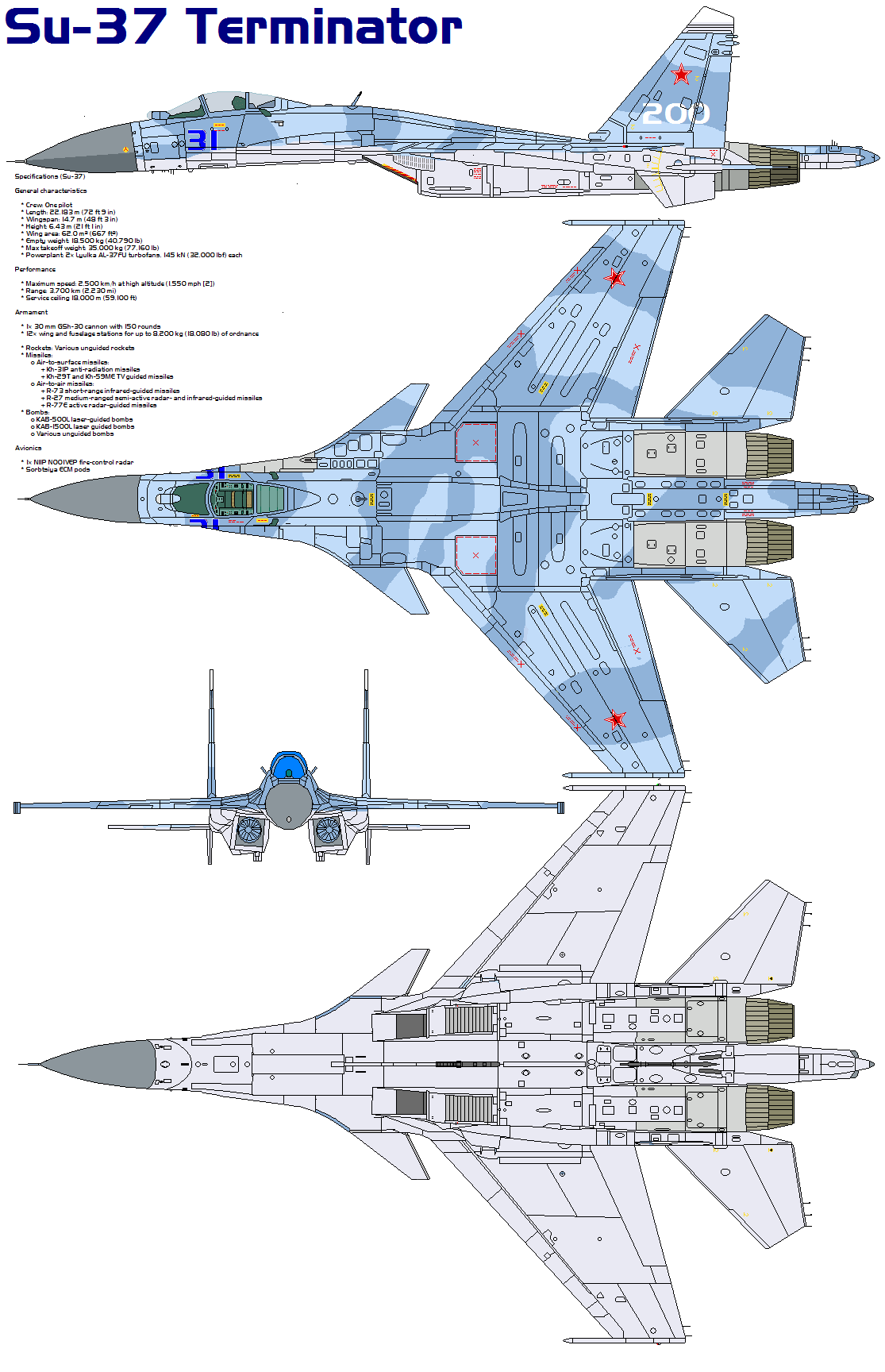 КонструкцияСамолет выполнен по схеме "неустойчивый интегральный триплан", сочетающей нормальную аэродинамическую схему с передним горизонтальным оперением. Конструкция планера в целом подобна Су-27, однако при создании Су-35/37 использованы новые алюминиево-литиевые сплавы, значительно расширено применение композиционных материалов. Для самолета разработано новое крыло с увеличенной относительной толщиной, позволяющее разместить больший объем топлива. Горизонтальное оперение представляет собой дифференциально отклоняемый стабилизатор, каждая консоль которого имеет собственный быстродействующий электрогидравлический привод. ПГО включено в общую цифровую электродистанционную систему управления самолетом и способно отклоняться в диапазоне углов -50/+100. Помимо улучшения характеристик устойчивости и управляемости на больших углах атаки (в частности, на Су-35/37 практически полностью удалось устранить тряску, сильно затрудняющую пилотирование и прицеливание истребителей других типов на подобных режимах), ПГО выполняет и ряд других важных функции. В частности, оно способствует смещению вперед аэродинамического фокуса самолета, что приводит к значительному уменьшению статической устойчивости. Посредством ПГО возможно "управление" степенью неустойчивости самолета, которая меняется в зависимости от нагрузки на внешних узлах подвески. При полетах на малой высоте в турбулентной атмосфере ПГО является активным и пассивным демпфером продольных колебании и тряски, что повышает безопасность полета, уменьшает нагрузки на планер и увеличивает комфорт, а, следовательно и боеспособность летчика в условиях болтанки. Аэродинамические усовершенствования, примененные на самолете, позволили добиться снижения нагрузок на фюзеляж и корневые части крыла, что, в свою очередь, обеспечило достижение установившейся перегрузки 10 ед. без усиления конструкции планера (максимальная установившаяся перегрузка, достигнутая на истребителях других типов, не превышает в настоящее время 9 ед.). По сравнению с Су-27 несколько увеличена высота и хорда вертикального оперения истребителя. Кессоны килей, выполненных из углепластика, используются, также, в качестве топливных баков. Усилены стоики шасси (что обусловлено возросшей взлетной массой самолета), носовая опора снабжена двумя колесами. Под крылом добавлено два узла внешней подвески (их общее число доведено до 14), что позволило увеличить вес вооружения с 6000 до 8000 кг. Самолет оснащен катапультным креслом КД-36ДМ с углом наклона спинки 300. По сравнению с Су-27 увеличен запас кислорода, установлены контейнеры с запасом пищи и воды, а также устройство утилизации отходов. Силовая установкаНа опытном самолете Су-37 (известном как борт №711) установлены двигатели АЛ-31ФП с системой управления вектором тяги по каналу тангажа. ТРДЦФ оснащен цифровой электронной системой управления, интегрированной с системой управления самолетом. Осесимметричное управляемое сопло отклоняется в вертикальной плоскости на угол 150 при помощи двух пар гидроцилиндров, питаемых от общесамолетной гидросистемы (угловая скорость перемещения сопел ≈ 300/сек). Серийные истребители Су-37 предполагается оснастить усовершенствованными двигателями АЛ-37ФП (2 х 14500 кгс), являющимися дальнейшим развитием ТРДДФ АЛ-31. В ТРДЦФ обеспечено 