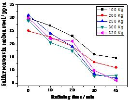Results from the experiments investigatingthe change of sulfur content in molten steel from different aluminum particle input masses are shown in Fig.2.To effect desulfurization and to achieve sufficient reactionbetween the deoxidizer and oxide, aluminum particles were added into the slag on average three times. As shown inFig.2, with the addition of 300kg of aluminum particles, the sulfur content in the molten steel after refining for 45min was reduced from the original 29to 7.9ppm and from 30 to 6 ppm with the addition of 320kg.