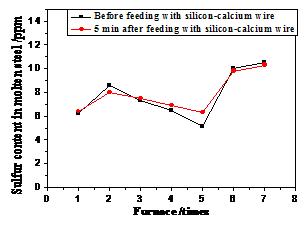 The seven pointsin Fig.4 show the sulfur content before feeding with silicon-calcium wire and the calcium content after feeding calcium with the molten steel in a different furnace. These points are located below the [Ca]-[S] equilibrium line at 1580°C.This indicates that calcium has no desulfurization ability. Fig.5 shows the sulfur content in molten steel after Ca-treatment and feeding with silicon-calcium wire. The sulfur content in the molten steel is essentially invariant and allare below 10ppm except for the sample from the seventhtrial. Feeding calcium with the molten steel helps retain the calcium content in the steel, inhibitsresulfurization and keeps the sulfur content low.