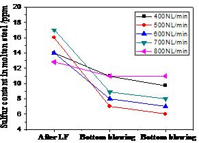 - When the argon inflow at the bottom of the furnace is 500 NL/min, the sulfur content in the steel is reduced to 6 ppm after 10 min. Too high or too low an argon flowrate will reduce the desulfurization efficiency.