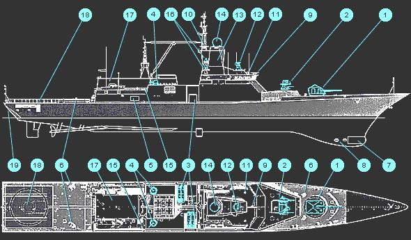 ВооружениеКорабль оснащен сложной технической системой вооружения в составе комплексов ударного, противовоздушного и противолодочного оружия, боевого управления, обнаружения, целеуказания, связи и защиты. Основу вооружения корвета составляет противокорабельный ракетный комплекс "Уран" в составе двух четырехконтейнерных пусковых установок (8 ПКР Х-35). Для противовоздушной обороны корабль оснащен боевым модулем ЗРАК типа "Кортик", ПЗРК "Игла" и двумя артиллерийскими комплексами АК-630М. Артиллерийское вооружение представлено новой 100-мм артустановкой АК-190 (боезапас 332 снаряда). Торпедное вооружение представлено двумя четырехтрубными 330-мм торпедными аппаратами "Пакет", которые могут применять противолодочные торпеды и ракеты. Радиоэлектронное вооружение корабля, кроме БИУС "Сигма", включает гидроакустический комплекс типа "Заря" с антенной в носовой бульбе, гидроакустическую станицю с гтюкой протяженной буксируемой антенной и РЛС типа "Позитив-М". Для самообороны и защиты от пиратов на борту корабля могут быть установлены 2 тумбовые 14,5-мм пулеметные установки. Использование вооружения возможно при волнении моря силой до 5 баллов. Модульный принцип строительства кораблей этого проекта позволяет при строительстве новых и модернизации существующих установить на них противокорабельные ракетные комплексы типа "Оникс" ("Яхонт") или "Клаб", а также корабельный ЗРК "Риф-М" коллективной обороны.