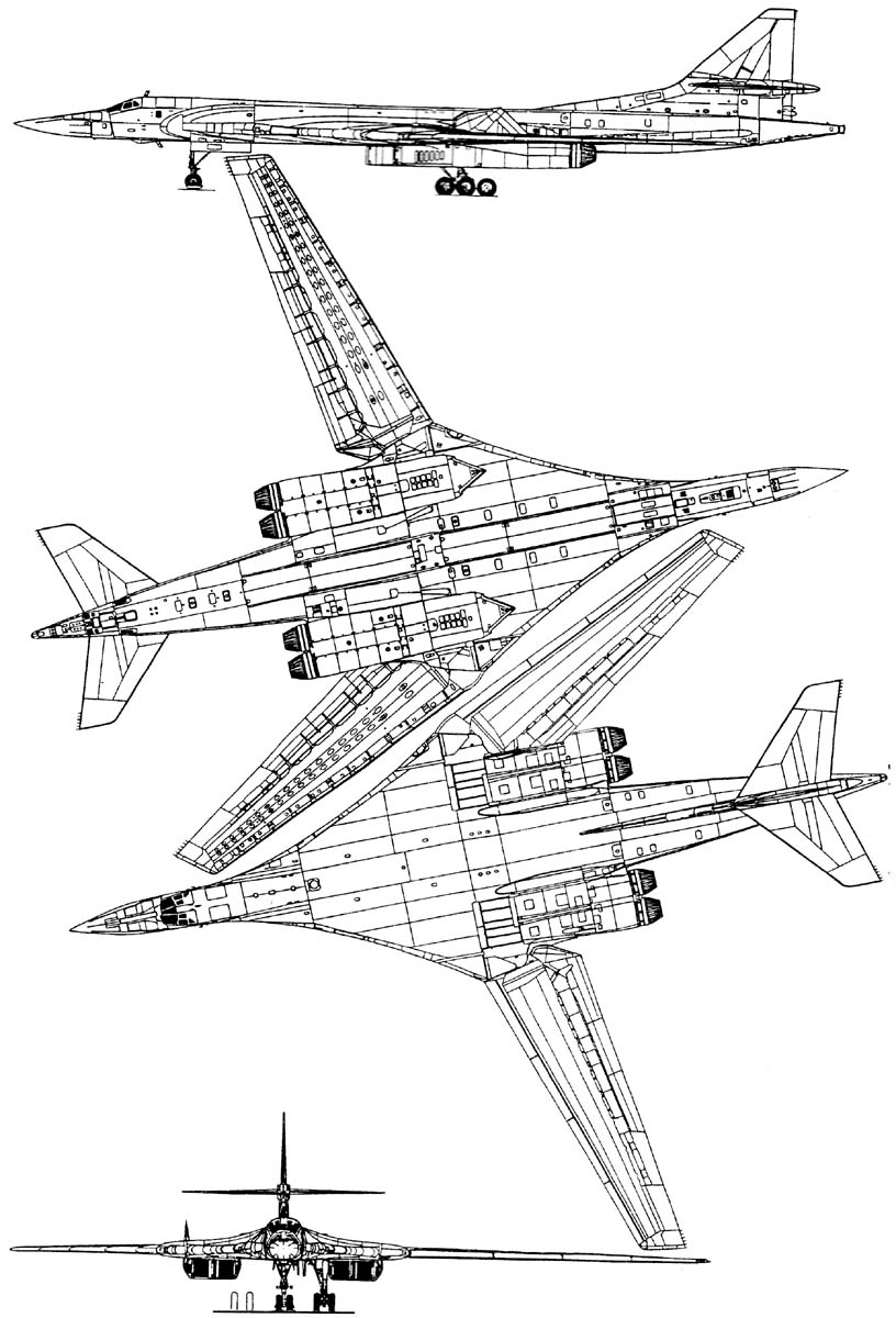 Стратегический бомбардировщикНачало работ над новым многорежимным стратегическим авиационным носителем в СССР можно отнести к 1967 году, когда к работам над ним приступили два отечественных авиационных ОКБ: ОКБ П.О. Сухого и только что восстановленное ОКБ В.М. Мясищева. 28 ноября 1967 года вышло правительственное постановление по новому самолету. От разработчиков требовалось спроектировать и построить самолет-носитель, обладающий исключительно высокими летными данными. Например, крейсерская скорость на высоте 18000 м оговаривалась 3200-3500 км/ч, дальность полета на этом режиме определялась в пределах 11000-13000 км, дальность полета в высотном полете на дозвуковой скорости и у земли соответственно равнялась 16000-18000 км и 11000-13000 км. Ударное вооружение оговаривалось сменным и включало в себя ракеты воздушного базирования (4 х Х-45, 24 х Х-2000 и др.), а также свободнопадающие и корректируемые бомбы различных типов и назначения, суммарная масса боевой нагрузки достигала 45 тонн. К началу 70-х годов оба ОКБ, основываясь на требованиях полученного задания и предварительных ТТТ ВВС, подготовили свои проекты. Оба ОКБ предлагали четырехдвигательные самолеты с крылом изменяемой стреловидности, но совершенно разных схем - Т-4МС, М-18 и М-20. В 1969 году ВВС сформулировали требования к перспективному стратегическому многорежимному самолету. Разработку предполагалось вести на конкурсной основе. Помимо ОКБ П.О.Сухого и ОКБ В.М. Мясищева, решено было привлечь к работам ОКБ А.Н. Туполева. До 1970 года ОКБ А.Н.Туполева присутствовало во всех этих перепитиях с новым "стратегом" лишь как наблюдатель, исправно участвуя во всех обсуждениях и заседаниях по теме. Загруженному текущей работой по большому количеству самолетов (во второй половине 60-х годов ОКБ выпустило на испытания Ту-154, Ту-144, Ту-22М, Ту-142) руководству ОКБ было не до новых заказов, хотя тема явно вписывалась в традиционное генеральное направление работ туполевцев. В 1970 году, оценив реальное положение дел и дальнейшие перспективы с разработкой новой стратегической машины в СССР, взвесив свои возможности и возможности своих конкурентов, ОКБ А.Н. Туполева приступило к работам по новому проекту, основываясь на требованиях выдвинутых в 1967 году. Проектные работы велись в отделении "К" ОКБ под общим руководством А.А. Туполева, в дальнейшем руководство было возложено на Главного конструктора В.И.Близнюка, долгие годы до этого работавшего в команде С.М.Егера, где он участвовал в проектировании системы "135"; затем была работа в отделении "К", где ему пришлось работать над проектами первых туполевских беспилотных сверхзвуковых ЛА (самолеты "121" и "123"), а затем долгие годы работать по СПС-1 Ту-144. Большой вклад в работу над проектом внес нынешний руководитель работ по Ту-144ЛЛ и СПС-2 Ту-244 А.Л.Пухов. Новый проект ОКБ первоначально получает шифр "156", просуществовавший не более одной недели. Вскоре условное обозначение по ОКБ меняется на "160" (Ту-160) - самолет "К" или изделие "70". На начальном этапе проектирования работы в ОКБ по теме шли практически в инициативном порядке без особой огласки, и о них знал весьма ограниченный круг людей в самом ОКБ и в МАП. На этом этапе у ОКБ были полностью развязаны руки в выборе возможной аэродинамической схемы и конкретных компоновочных решений будущего самолета. В ОКБ решили сделать ставку на использова