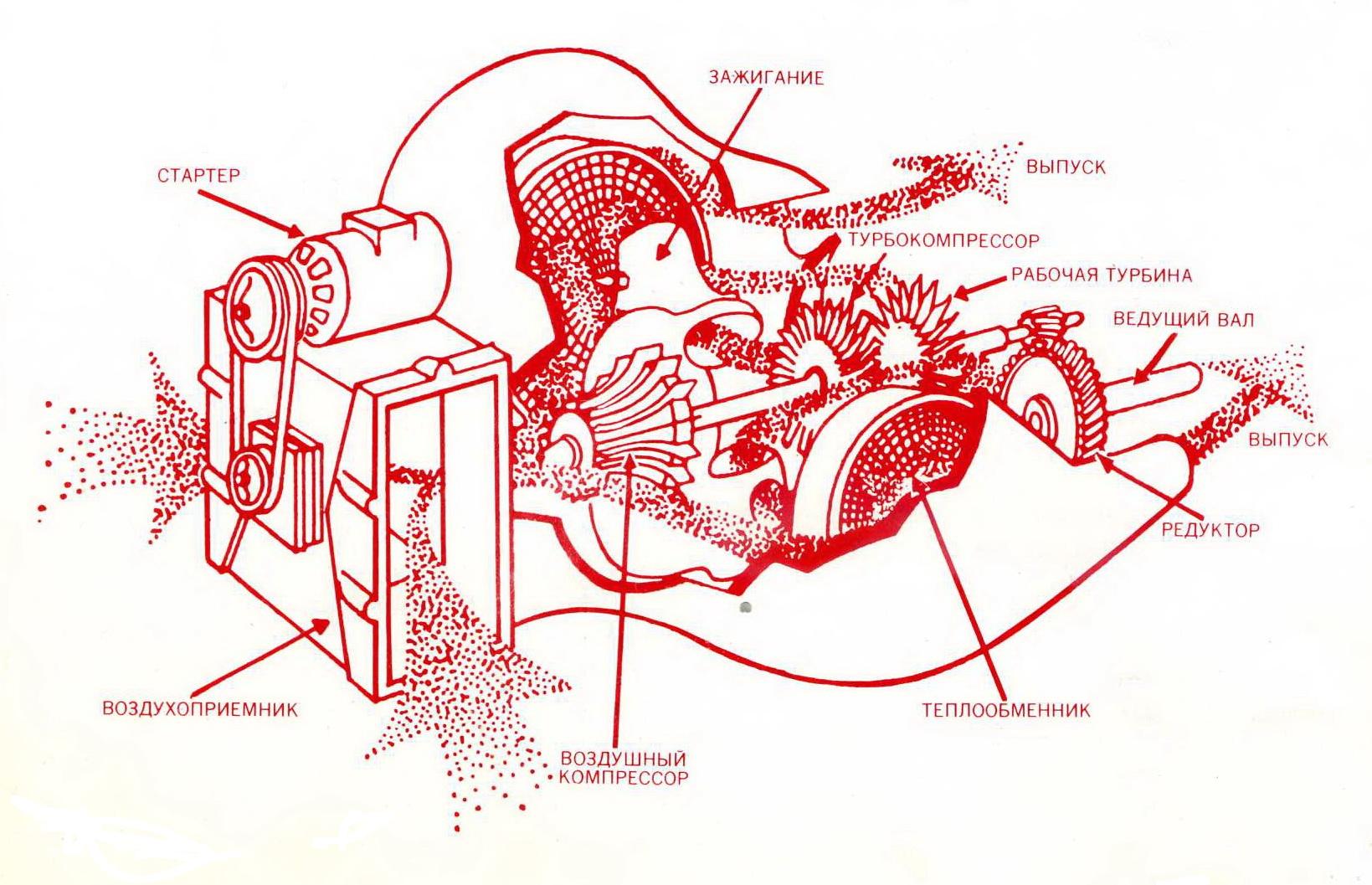 Двигатель Брейтона Это газовая турбина. Воздух поступает через два впускных отверстия. После сжатия в компрессоре воздух попадает в теплообменник для нагревания, а затем в камеру сгорания, где о смешивается с горючей смесью и нагревается до температур свыше 800 градусов. Затем раскаленный воздух подается на лопатки главной рабочей турбины и турбины воздушного компрессора, после чего вновь поступает в теплообменник и выбрасывается через выпускной клапан. Теплообменник является по сути рекуператором тепла. Он получает тепловую энергию от отработанных продуктов и нагревает воздух, поступающий в теплообменник из компрессора.