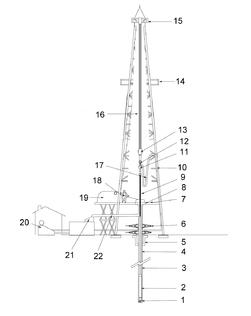 Общая схема буровой установки: 1 — буровое долото; 2 — УБТ; 3 — бурильные трубы; 4 — кондуктор; 5 — устьевая шахта;6 — противовыбросовое устройства; 7 — пол буровой установки; 8 — буровой ротор; 9 — ведущая бурильная труба; 10 — буровой стояк; 11 — вертлюг; 12 — крюк; 13 — талевый блок; 14 — балкон верхового рабочего; 15 — кронблок; 16 — талевый канат; 17 — шланг ведущей бурильной трубы; 18 — индикатор нагрузки на долото; 19 — буровая лебёдка;20 — буровой насос; 21 — вибрационное сито для бурового раствора; 22 — выкидная линия бурового раствора.